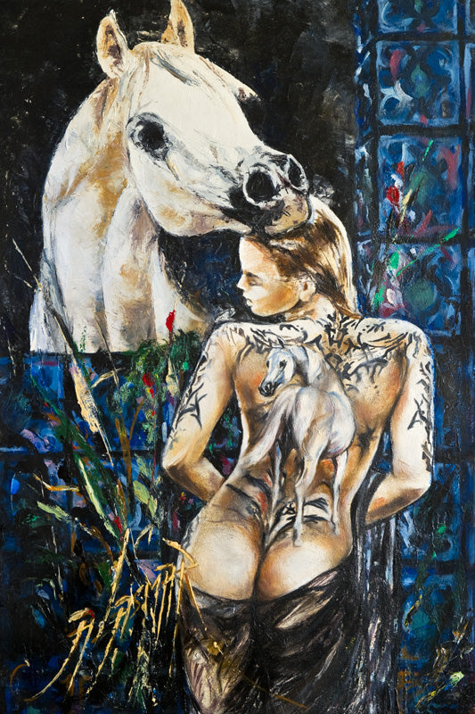 Palette Knife Oil Painting on Canvas of "Bath with Arabian" 36"x24" With Frame